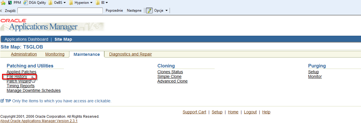 Jak mamy Administratora Systemu, uruchamiamy Oracle Application Manager’a, a potem stronę File History.